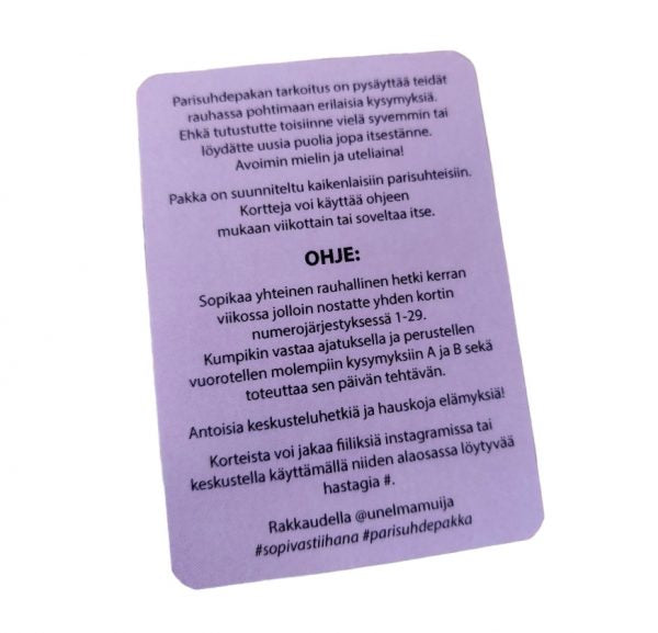 Parisuhdepakan olen suunnitellut kaikenlaisiin parisuhteisiin.Olettepa tuore pari tai viettäneet yhdessä jo vuosia.